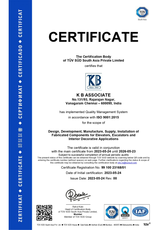 We are ISO 9001:2015 certified organization with the scope of Design, Development, Manufacture, Supply, Installation of Fabricated Components for Elevators, Escalators and Interior Decorative Applications.